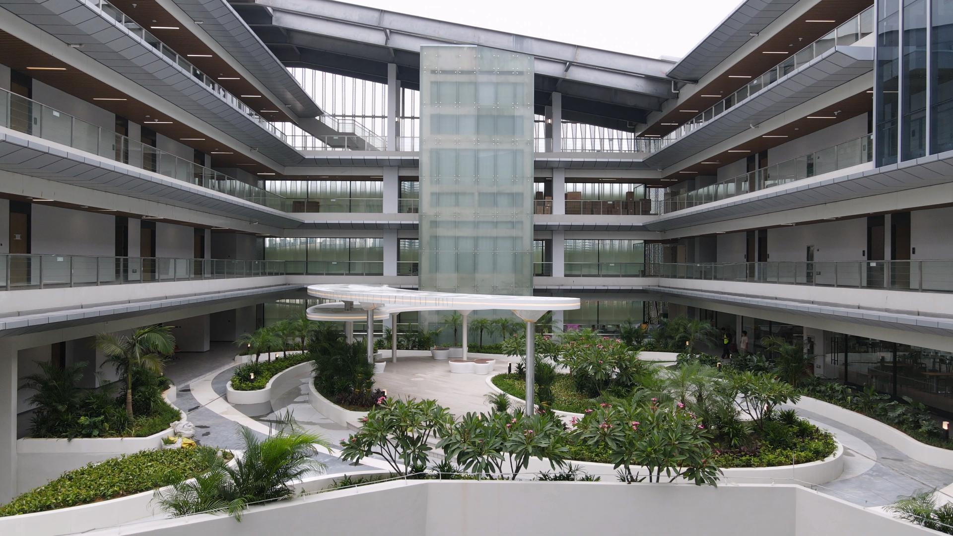 室外景观的屋顶花园与立体绿化在雨水滋润下更显生机,东南亚特色植物组团勾勒出异域风情画卷。以“智慧之门”“合作之庭”为代表的主题景观,经雨水浸润后光影变幻,配合互动地灯,营造出虚实交融的沉浸式体验,完美诠释了绿色科技理念。