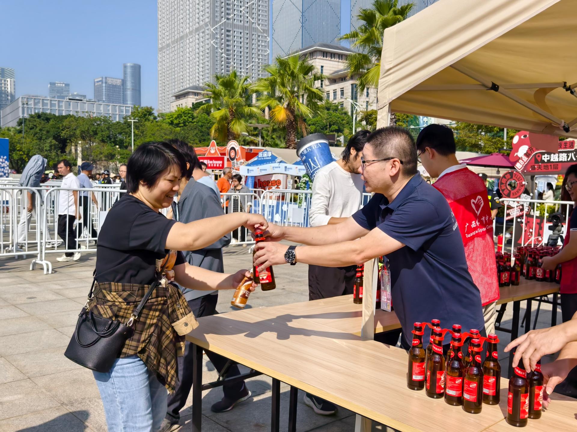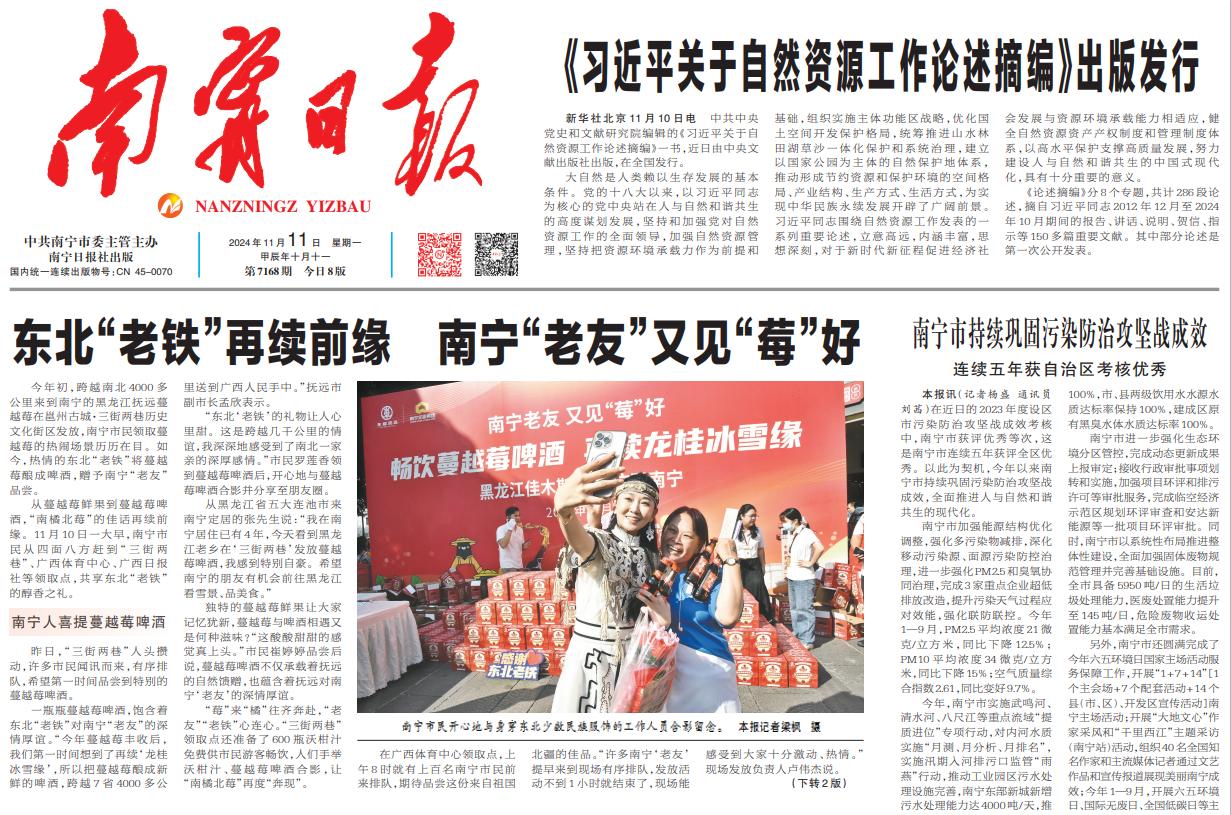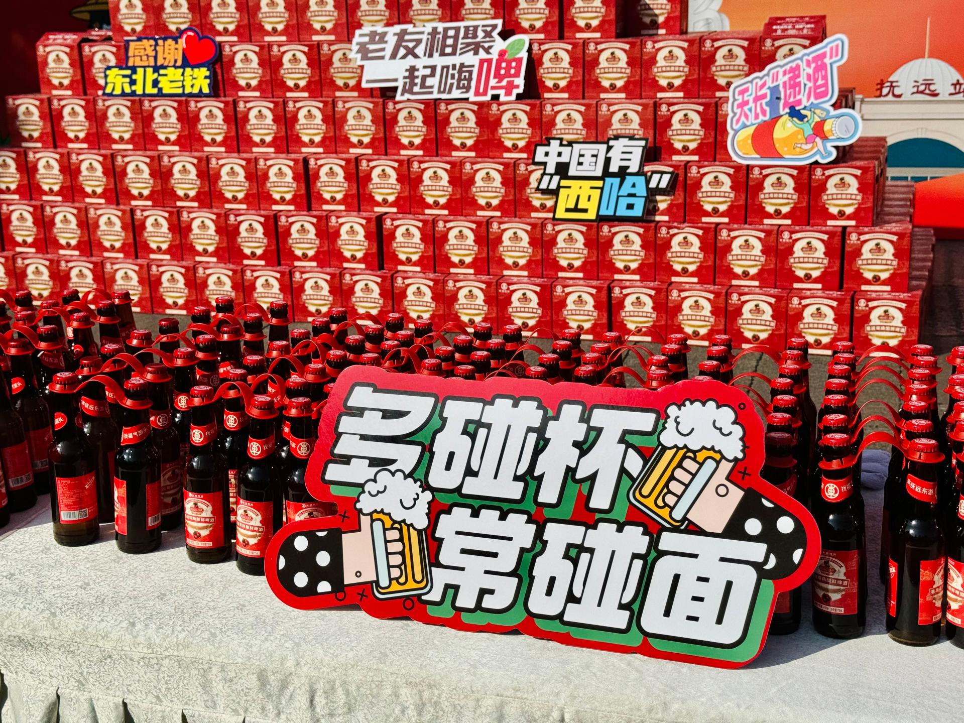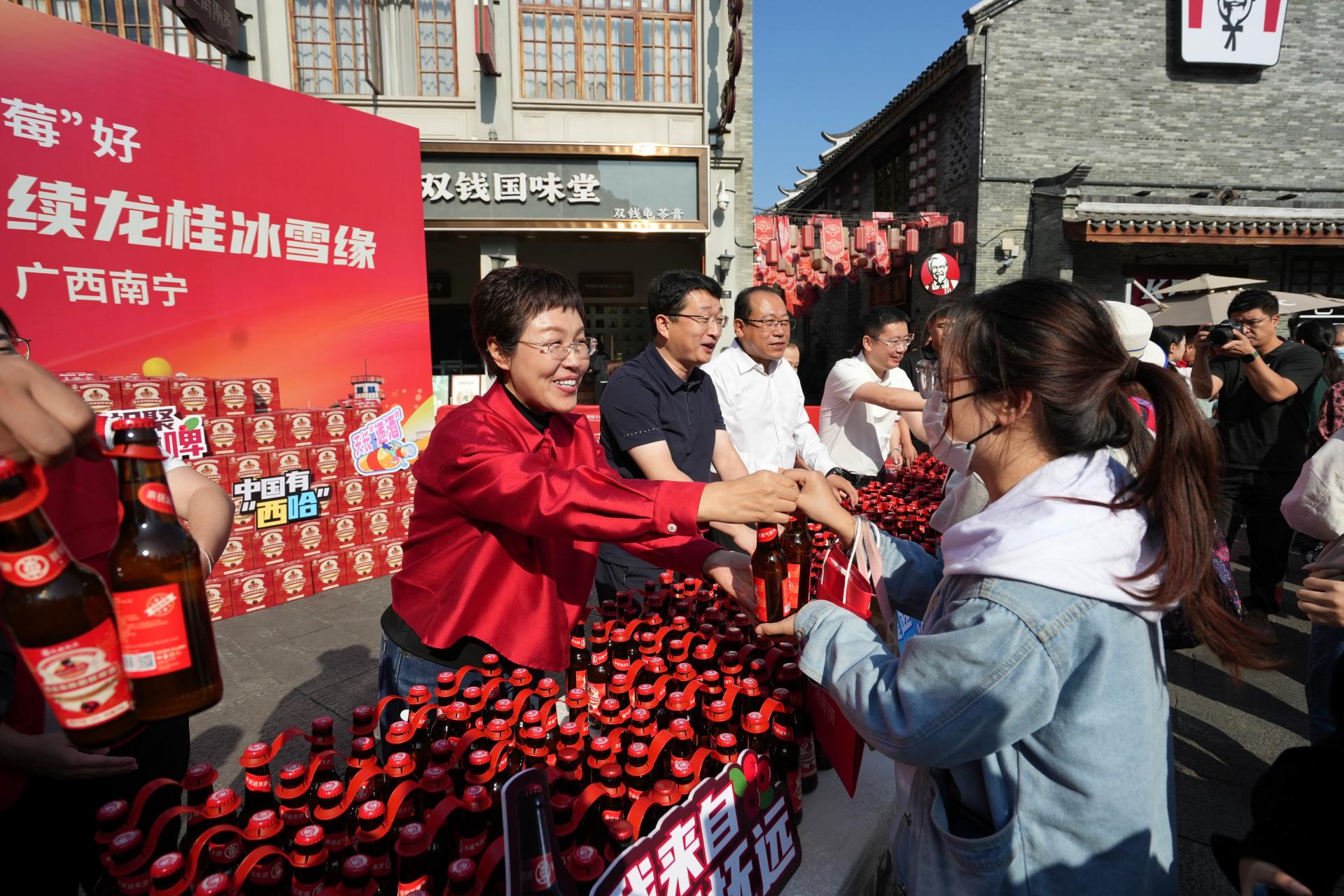 2024年年初,跨越南北3650公里来到南宁的东北蔓越莓在邕州古城·三街两巷发放,南宁市民领取蔓越莓的热闹场景依旧历历在目。如今蔓越莓再丰收,热情的东北“老铁”将蔓越莓“变身”酿成啤酒赠予南宁“老友”品尝。11月10日,南宁威宁集团下属南宁文化旅游集团有限责任公司(以下简称南宁文旅集团)的两大标志性项目——邕州古城·三街两巷与广西体育中心,成为了蔓越莓啤酒的发放站点,而银河大酒店、乡村大世界、五象山庄、邕城印记民俗中心等南宁文旅集团旗下餐饮品牌也将蔓越莓啤酒与各种美食相结合,为市民们安排了一系列赠饮品尝活动。