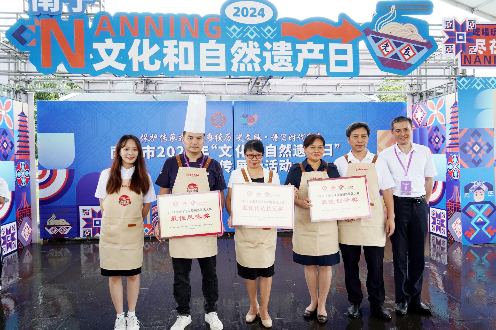 同时,在活动现场举办的南宁市2024年“文化和自然遗产日”南宁老友粉制作技艺大赛上,银河大酒店以精湛的老友粉制作技艺和独特的味道创新,赢得了评委和现场市民的喜爱,其中制作的“古城老友猪杂粉”荣获“最佳创新奖”,“古城老友干捞粉”荣获“最佳风味奖”,“古城老友炒粉”荣获“最佳传统技艺奖”。