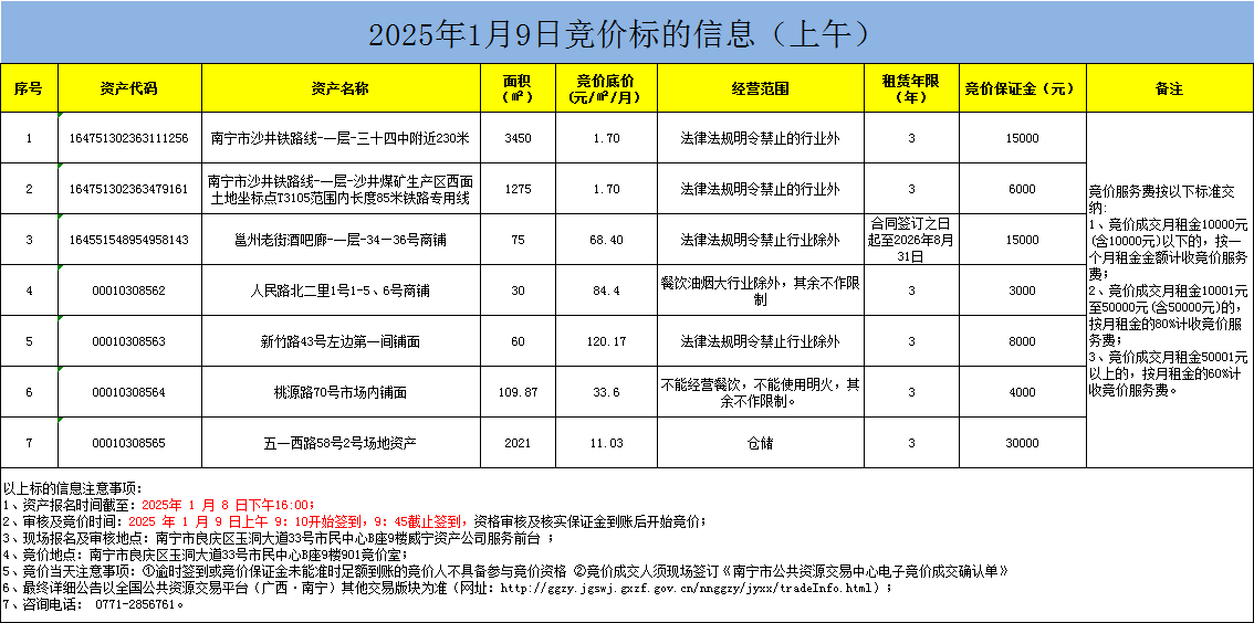 2025年1月9日竞价标的信息(现场竞价)