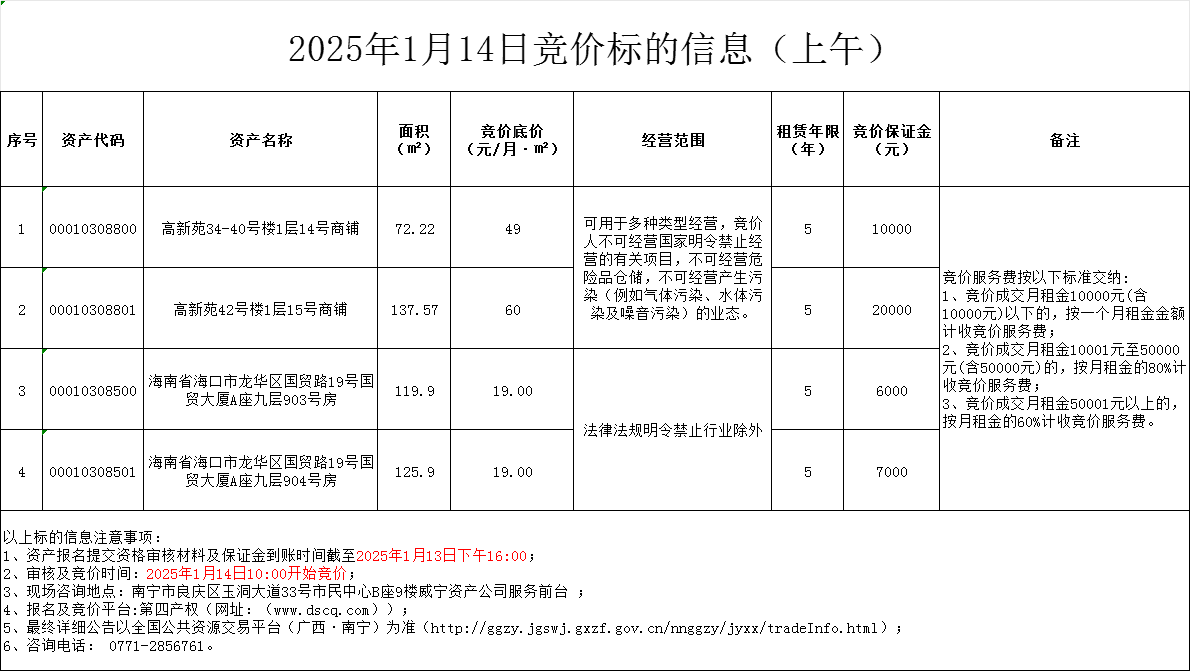 2025年1月14日竞价标的信息(线上竞价)