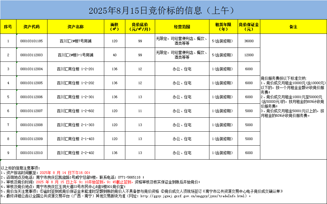 2025年8月15日竞价标的信息(现场竞价)