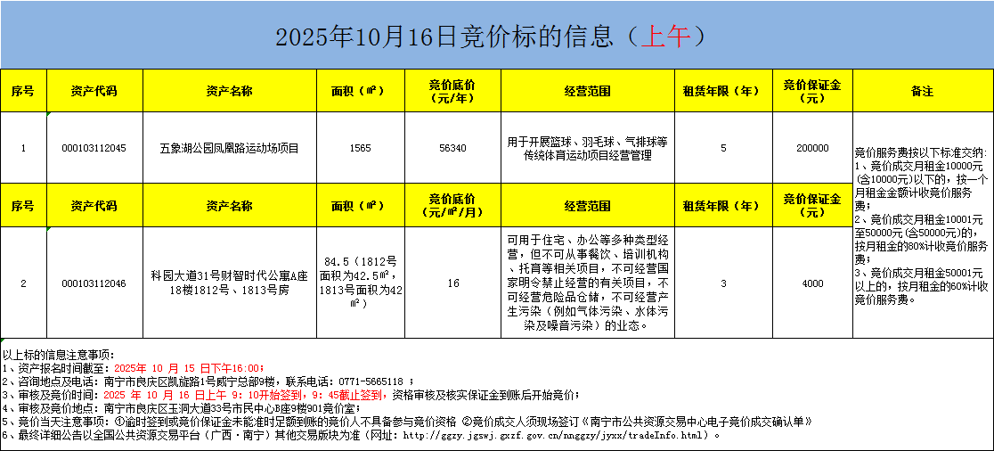 2025年10月16日竞价标的信息(现场竞价)