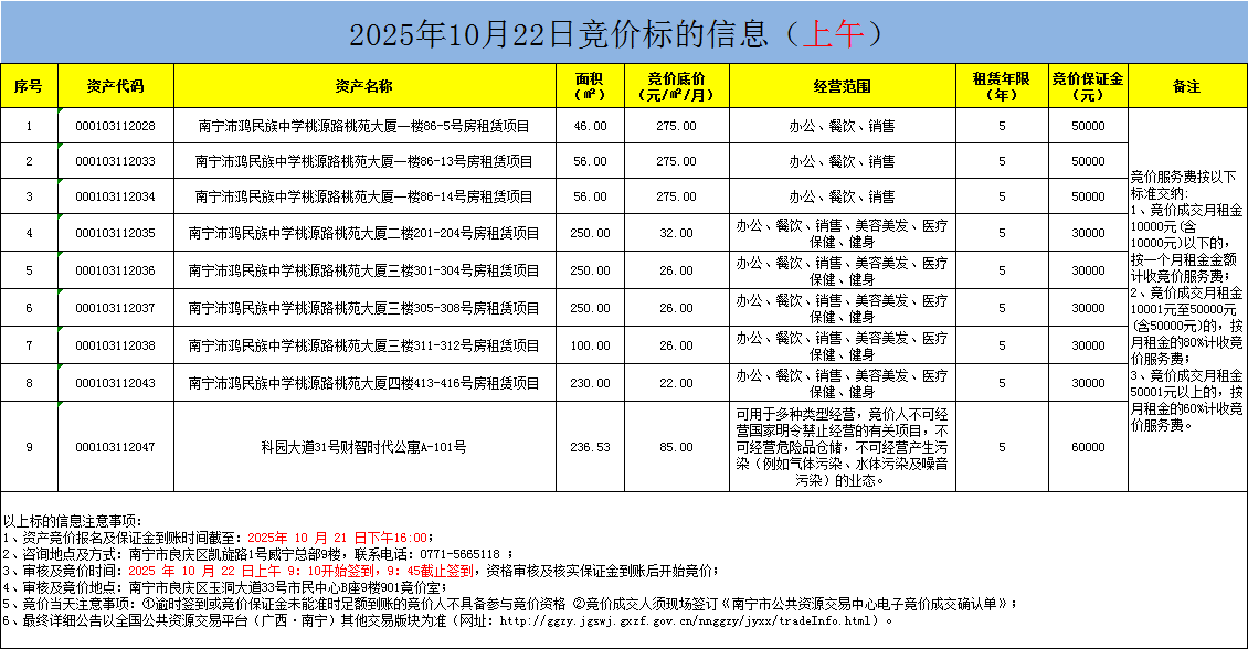 2025年10月22日竞价标的信息(现场竞价)