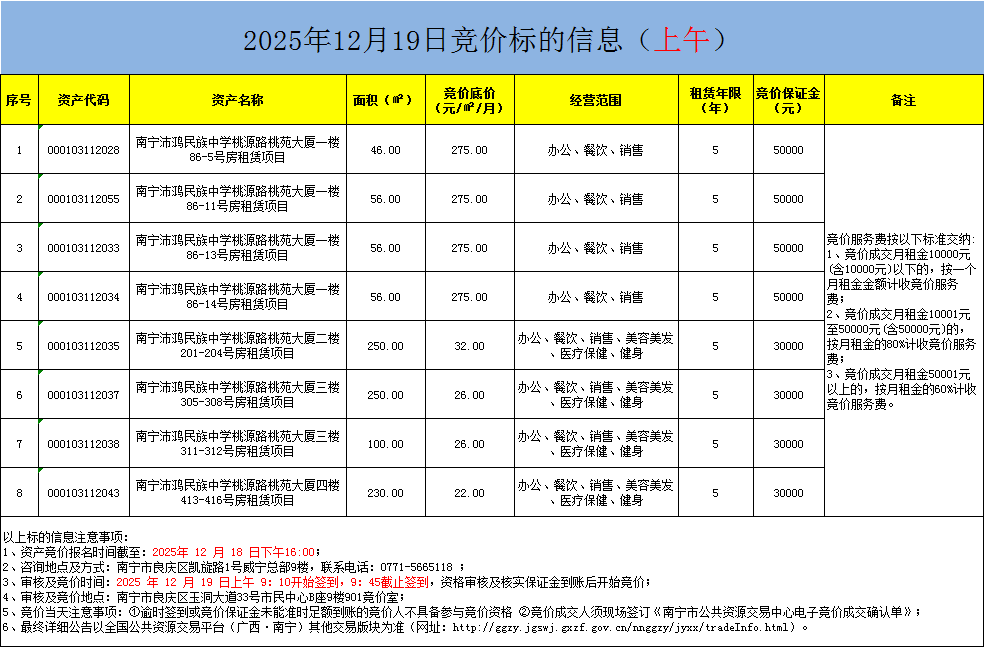 2025年12月19日竞价标的信息(现场竞价)