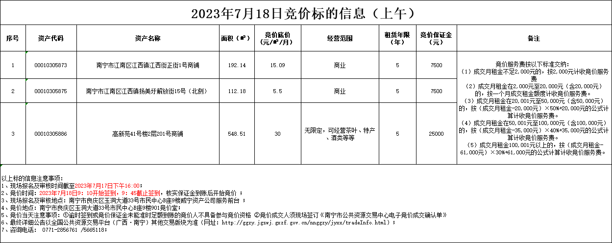 2023年7月18日竞价标的信息