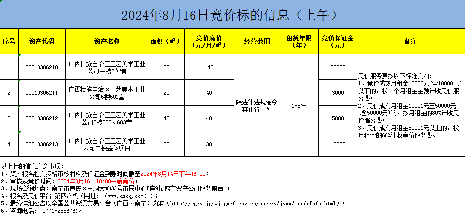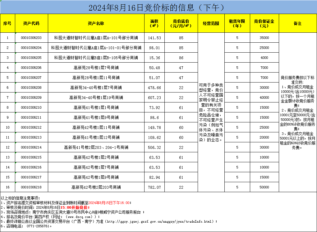 2024年8月16日上午/下午竞价标的信息(线上竞价)