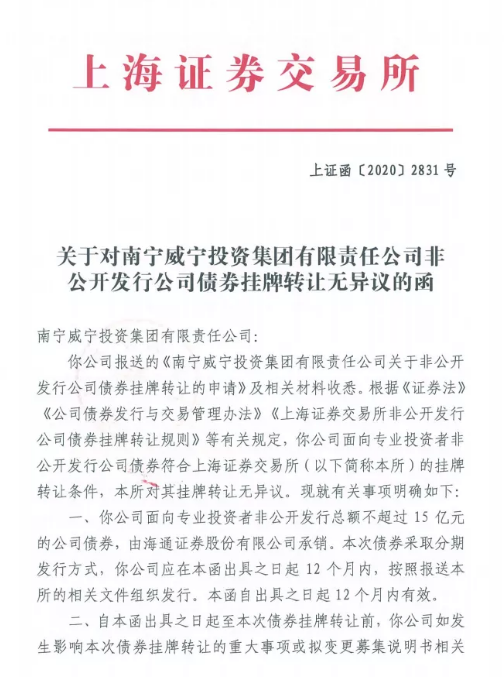 2020年12月17日,集团收到上海证券交易所(以下简称“上交所”)《关于对南宁威宁投资集团有限责任公司非公开发行公司债券挂牌转让无异议的函》,成功申报15亿元私募公司债发行额度。