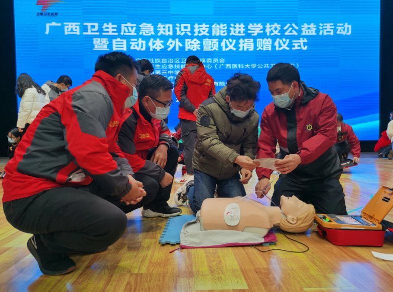 2020年12月16日,自治区卫生健康委联合南宁急救医疗中心举办卫生应急知识技能进学校公益活动暨自动体外除颤仪捐赠仪式,威宁文体公司副总经理黄庆全带队参加活动,并代表公司受赠自动体外除颤仪(AED)。
