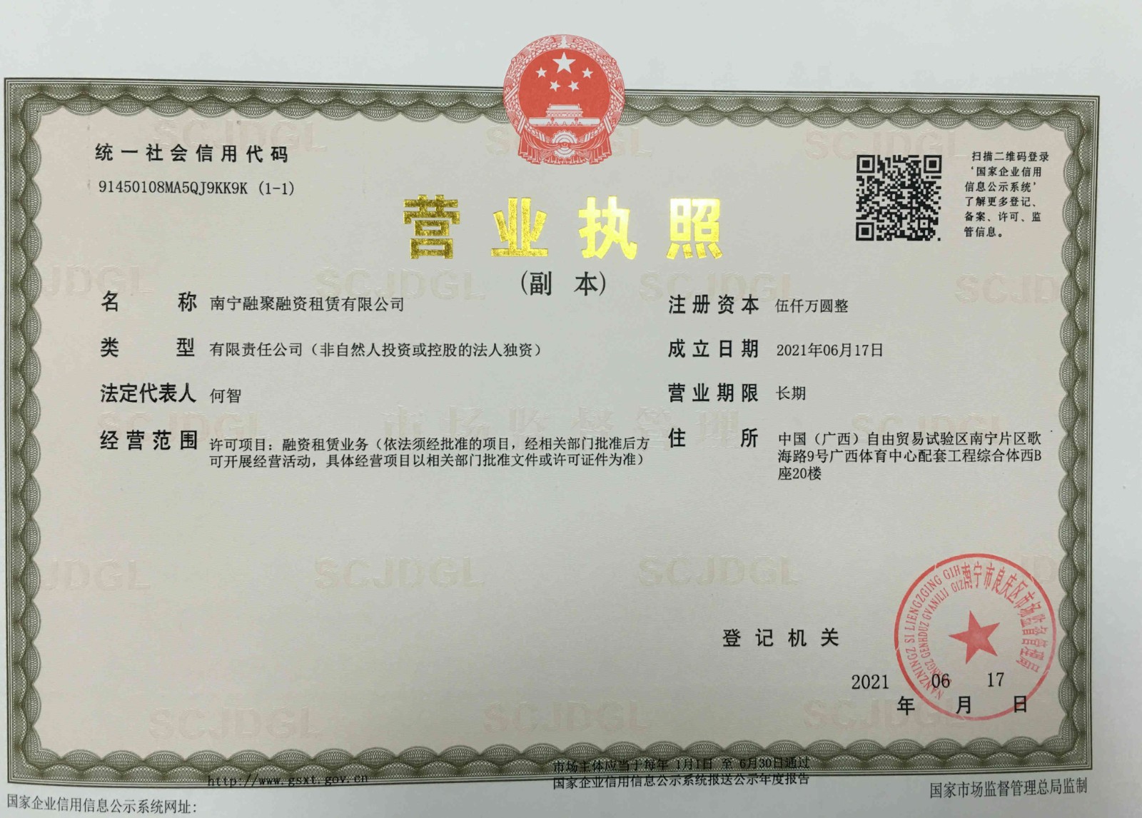 2021年6月17日,南宁威宁集团顺利取得南宁融聚融资租赁有限公司(以下简称融聚租赁公司)营业执照,标志着融聚租赁公司正式成立,至此集团成为目前市属国有企业中第二家设立融资租赁公司的企业,也标志着集团继小额贷款牌照后又取得一块金融牌照。集团作为我市首家国有资本运营公司,具“资产管理平台、股权管理平台、产业投资平台、金融服务平台、国企改革平台” 五大基础功能。“十四五”期间,集团将更加深度聚