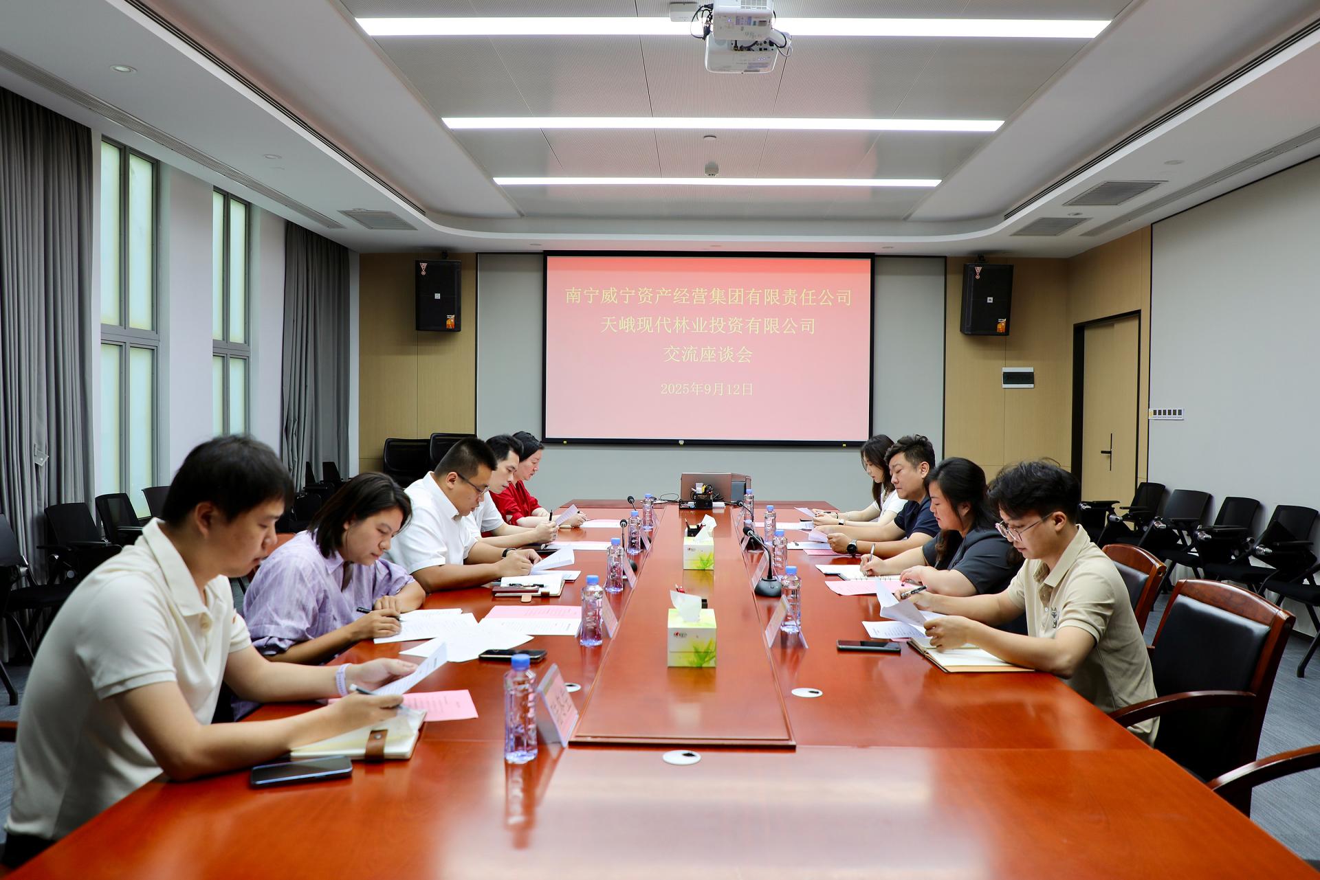座谈会现场9月12日,南宁威宁集团所属威宁资产经营集团与来访的天峨现代林业投资有限公司(以下简称“天峨林投公司”)召开工作座谈会,双方围绕国有资产运营管理工作进行交流座谈。威宁资产经营集团副总经理黄轩、潘涌对天峨林投公司常务副总经理任玉强一行的到来表示热烈欢迎,希望通过座谈交流进一步搭建沟通桥梁,实现经验互通,携手共谋发展篇章。随后,威宁资产经营集团向天峨林投公司分享了国有资产运营及管理工作经验...