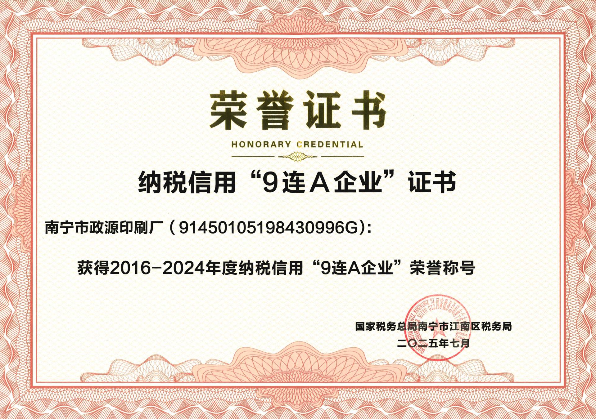 连续9年!南宁市政源印刷厂喜获2016-2024年度纳税信用“9连A企业”荣誉称号