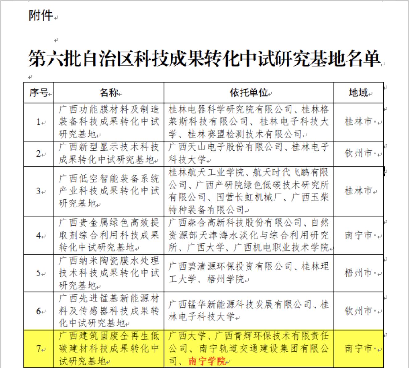获批名单十月,广西壮族自治区科学技术厅发布《自治区科技厅关于公布第六批自治区科技成果转化中试研究基地名单的通知》(桂科发〔2025〕413号),南宁威宁集团所属南宁学院携手广西大学、广西青辉环保技术有限责任公司、南宁轨道交通建设集团有限公司联合申报的“广西建筑固废全再生低碳建材科技成果转化中试研究基地”成功获批,这标志着南宁学院在科技成果转化与产学研协同创新领域迈出关键步伐。此次获批的中试研究基地,依...