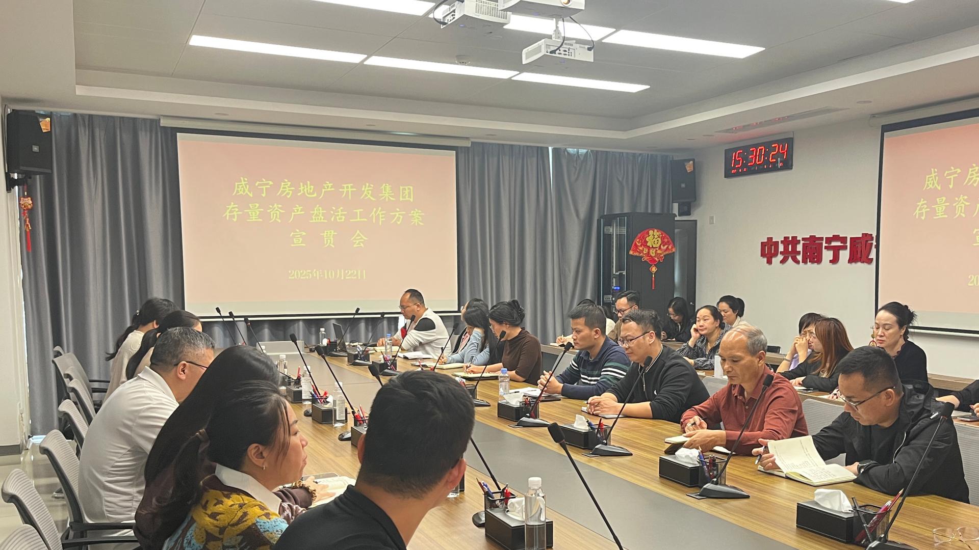 会议现场2025年10月22日,南宁威宁集团下属企业威宁房地产开发集团组织召开《存量资产盘活方案》宣贯会,系统部署存量资产盘活工作,动员全体员工凝聚共识、协同发力,推动资产价值高效释放。威宁房地产开发集团各部门负责人、各下属企业主要负责人及相关业务骨干近40人参会。会上,有关负责人围绕方案内容进行了全面宣贯和深入解读,该方案不仅确立了以“销售与出租”双轮驱动的盘活策略,更明确了阶段性任务与长远目标,建...