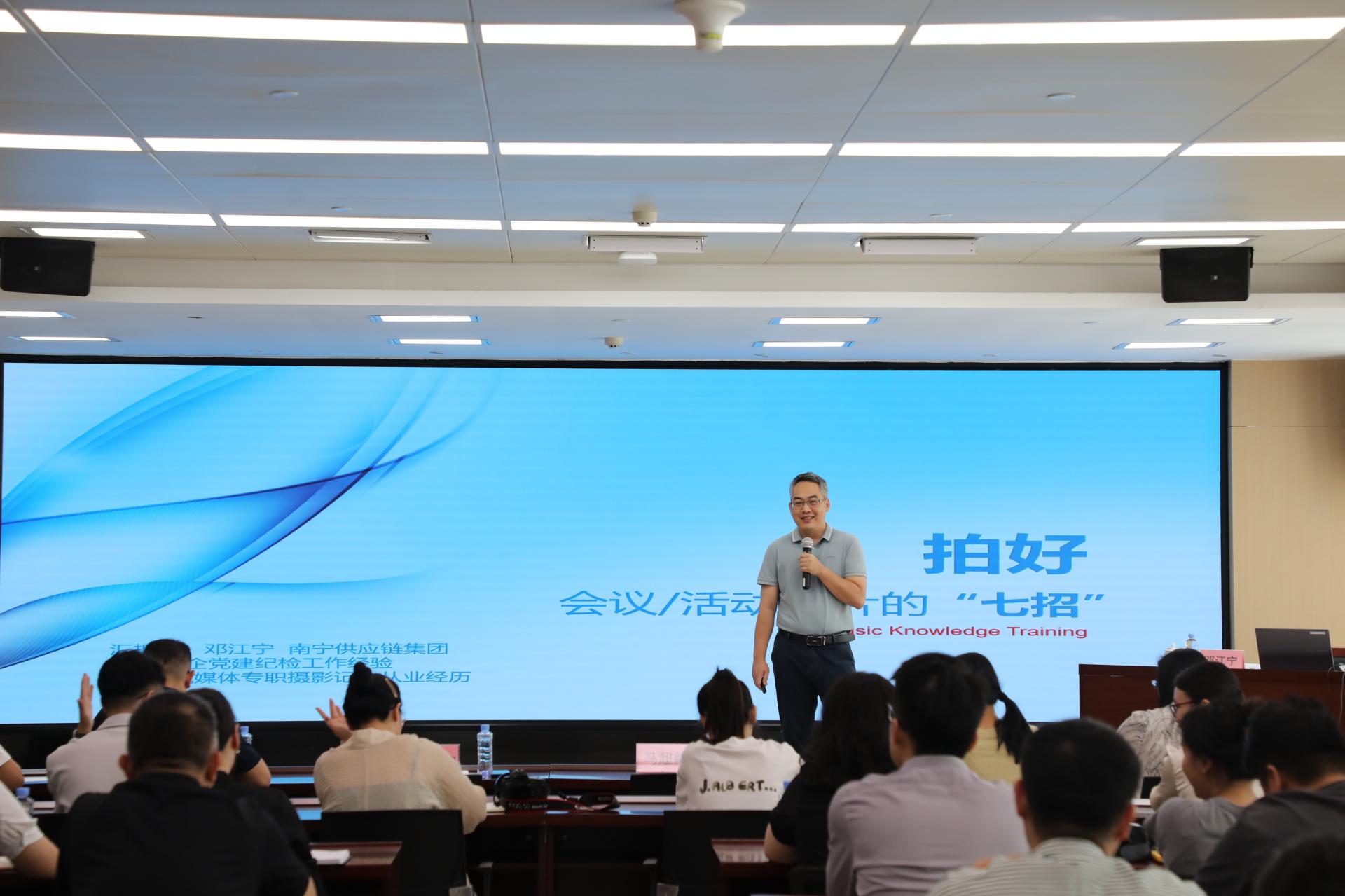 本次培训特别邀请了南宁供应链集团纪委书邓江宁担任主讲老师,邓江宁曾在市属主流媒体担任摄影记者5年,拥有扎实的摄影理论功底和丰富的重大会议活动拍摄经验,其作品多次在市级媒体刊登发表并获奖。培训中,他围绕“拍好会议/活动照片的‘七招’”层层展开,从器材准备、专业态度、拍摄距离、拍摄方式到规避内容、站位选择及配图等全流程进行了规范指导,强调高水平的宣传图片应具备独立叙事性,“优质的画面本身应能清晰传递信息核心”。理论讲解后,参训学员集体前往分会场,由邓江宁针对签约场景进行实操演练讲解,现场答疑解惑。学员们积极参与,将理论基础融入实践,有效规范了宣传拍摄流程。