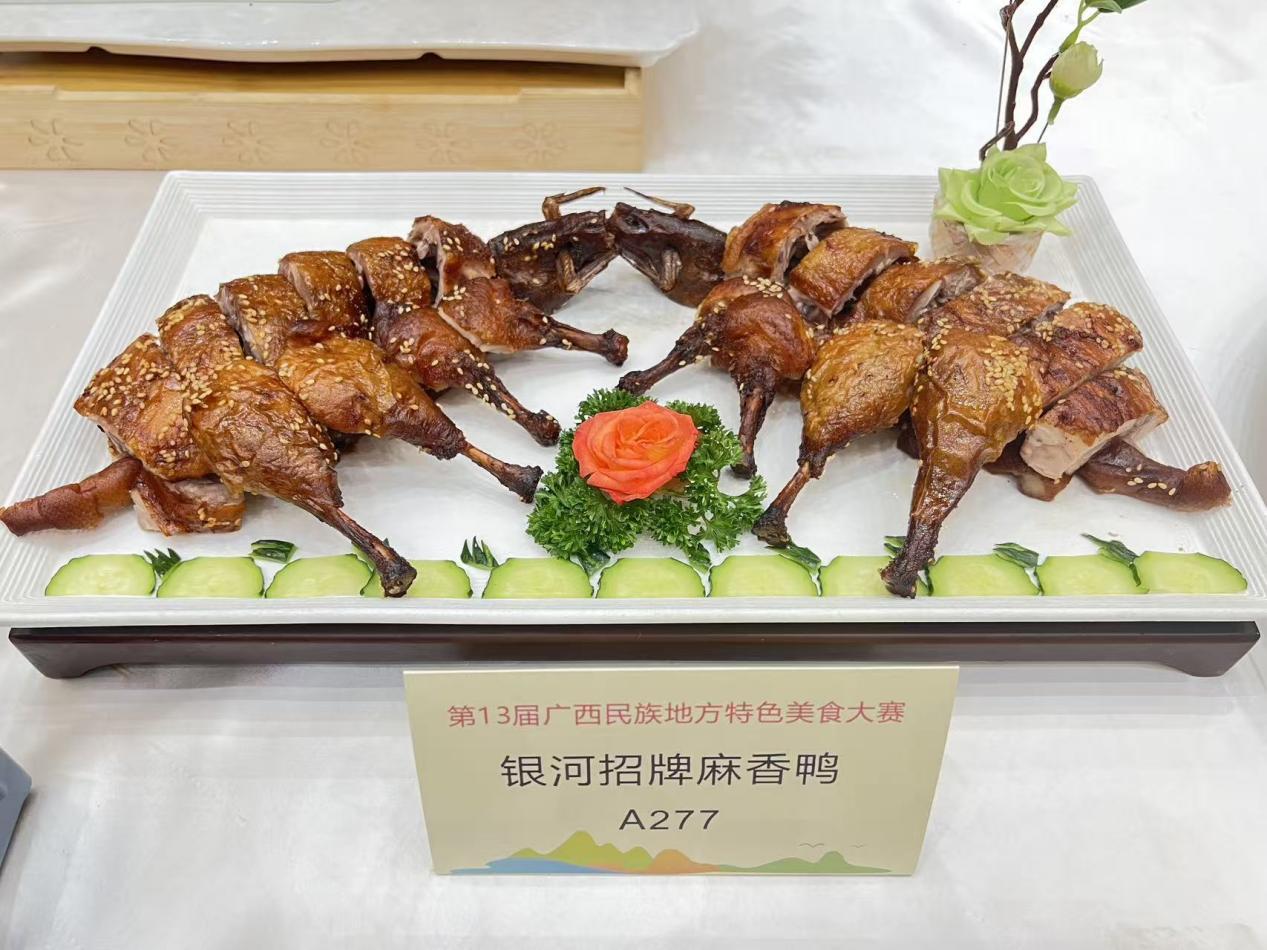 本次参赛,银河大酒店紧扣“讲好南宁故事、做精桂菜味道”理念,精心打造兼具文化厚度与味觉记忆的菜品矩阵。其中,“邕城印记六小样”堪称老南宁饮食文化的 “活态传承” 之作——酒店通过深入走访南宁老街巷,系统梳理了本土饮食脉络,将马蹄糕、炒粉虫、鸳鸯糊、酸嘢、鸡仔饼、芋头糕六类品种,以“一碟六味、一口乡愁”的精致形式匠心呈现。每一款小食均坚守传统工艺,又通过摆盘美学与分量优化,适配现代消费场景,让食客在方寸餐盘间品味南宁的历史与烟火。另一款获奖作品《银河招牌麻香鸭》,则是 “传统邕味 + 创新工艺” 的典范,最终实现“麻而不燥、酥而不腻、骨酥肉嫩、齿颊留香”的口感突破,满足了当下消费者对复合风味的需求,赢得评委“味型精准、工艺精湛、记忆点强”的高度评价。