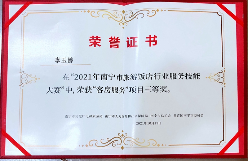 近日,银河大酒店在由南宁市文化广电和旅游局、人力资源和社会保障局、市总工会、共青团南宁市委员会共同主办的2021年南宁市旅游饭店行业服务技能大赛中荣获最佳组织奖,客房部员工李玉婷获客房服务项目三等奖。