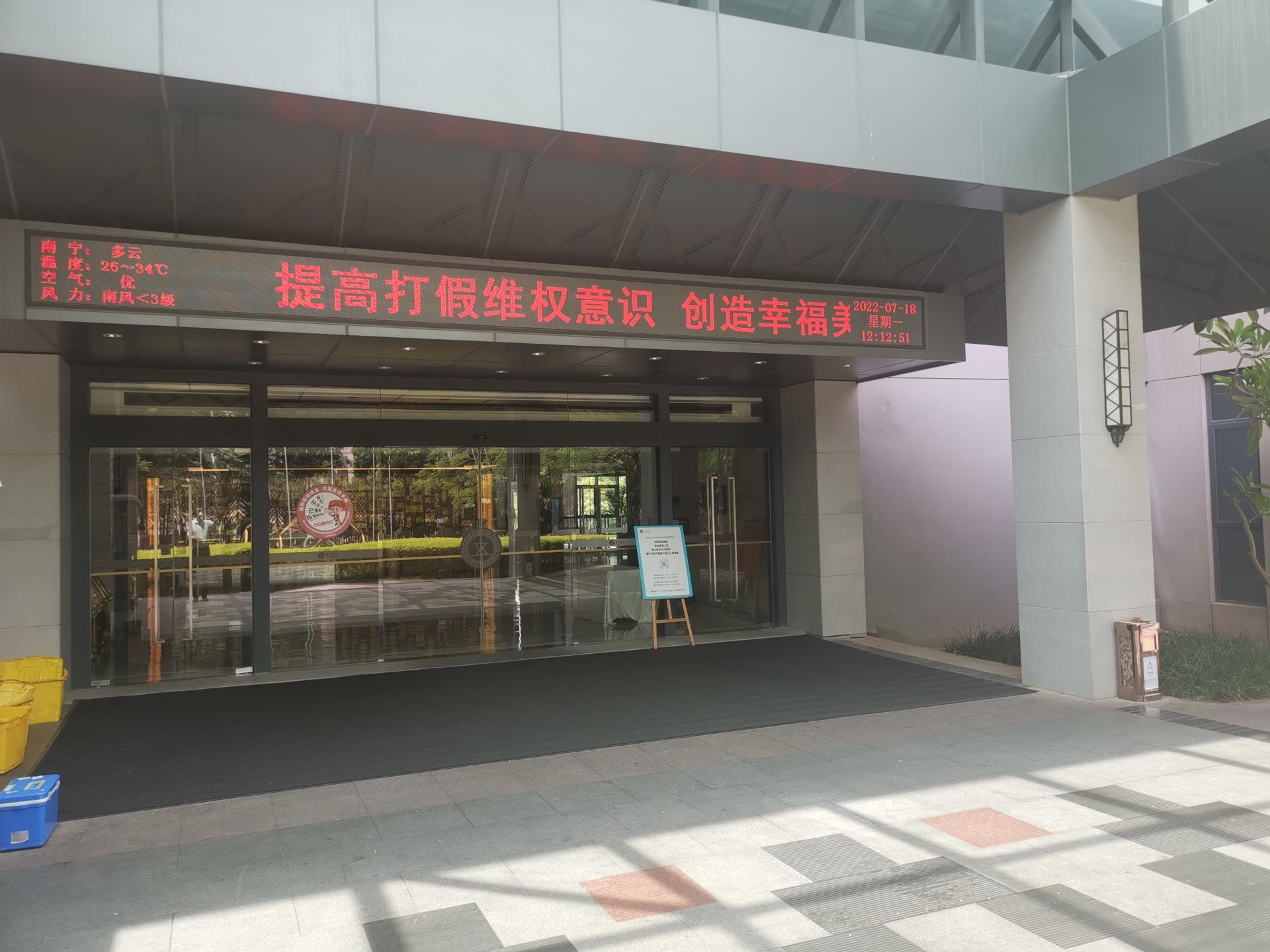 如南宁大地飞歌集团、民族影城、五象山庄、银河大酒店等利用餐饮服务行业人流量大、受众多、范围广的宣传优势,通过宣传板报、LED屏滚动播放“加强知识产权保护,营造良好营商环境”“尊重知识、崇尚创新、诚实守法、公平竞争”等宣传标语。