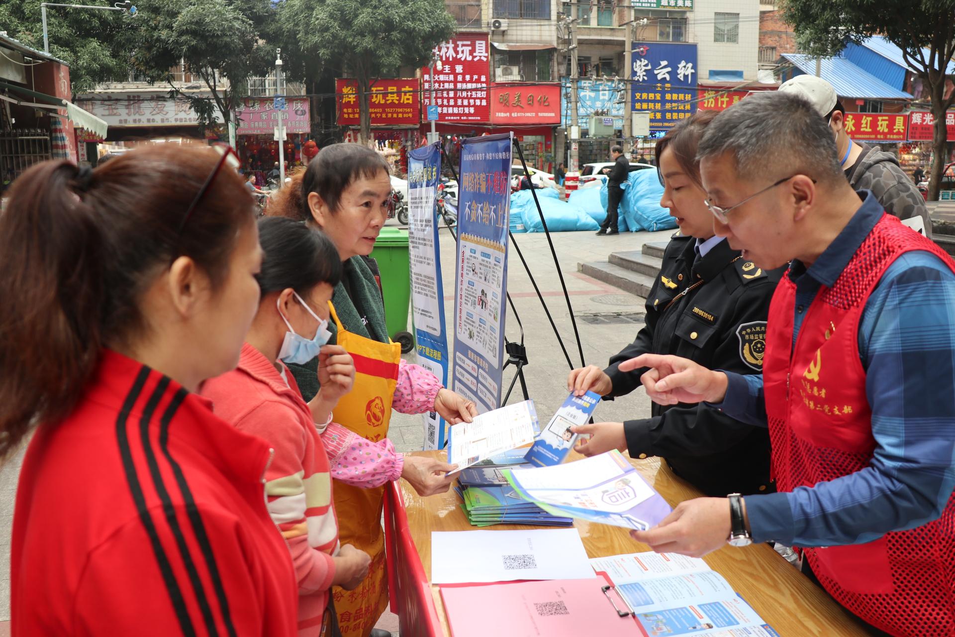 在公司所属南宁交易场,公司“威惠星”志愿者与兴宁区市场监督管理局朝阳市场监管所工作人员深入市场各行业,向经营户发放文明诚信经营宣传手册和共建放心消费市场倡议书,指导市民群众正确使用公平秤,并对消费维权、预防欺诈等案例分析讲解,帮助市民群众提升辨假识真能力,进一步构建诚信经营、放心消费的良好环境。