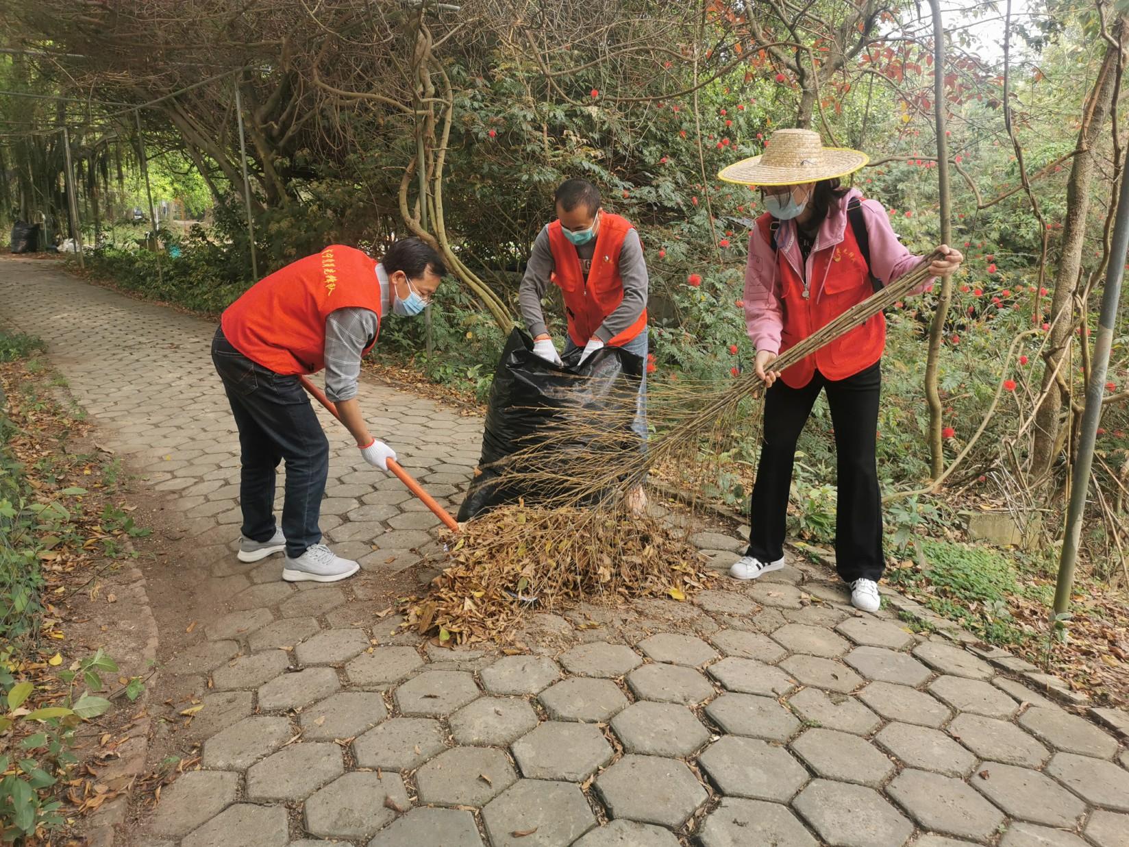 在简短的“鼓劲仪式”之后,党员志愿者们身着红马甲、手持扫把等劳动工具,在负责人的带领下,以饱满的状态投入到志愿服务活动中。活动现场采取分片包干的形式,兵分五路对园区主干道、鱼塘、停车场、客房及周边的区域开展落叶清扫、拾捡垃圾、卫生死角清理等工作。