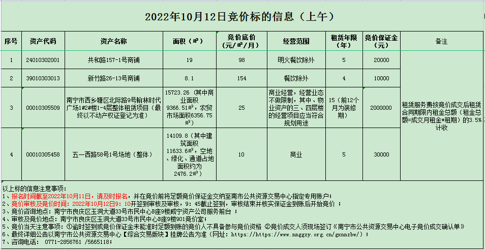 2022年10月12日竞价标的信息