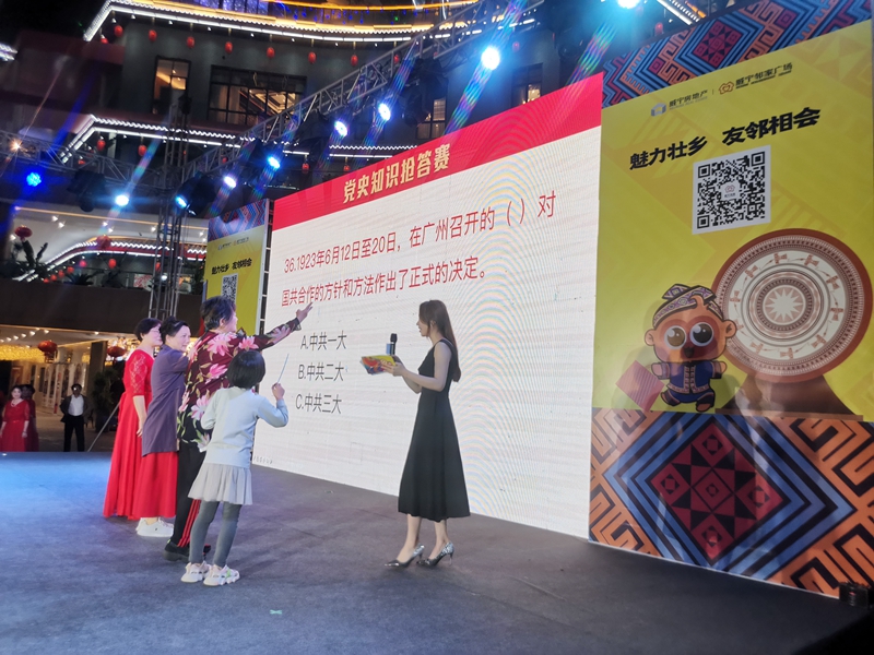 图党史知识抢答赛图 活动现场党史知识展板“壮族三月三”期间,威宁房地产公司所属威宁·金菊邻家广场通过精心策划,将党史学习教育与“三月三”民俗体验活动创新结合,推动党史学习教育深入社区群众、深入基层人心,通过搭建文化传播载体,推动党史学习教育走深走实。民俗体验活动中安排了跳竹竿舞、抛绣球、踩高跷、碰鸡蛋等传统互动游戏,展现了广西少数民族文化的多彩风情,现场还汇集展示展销了各色传统美食和手工艺制品,从