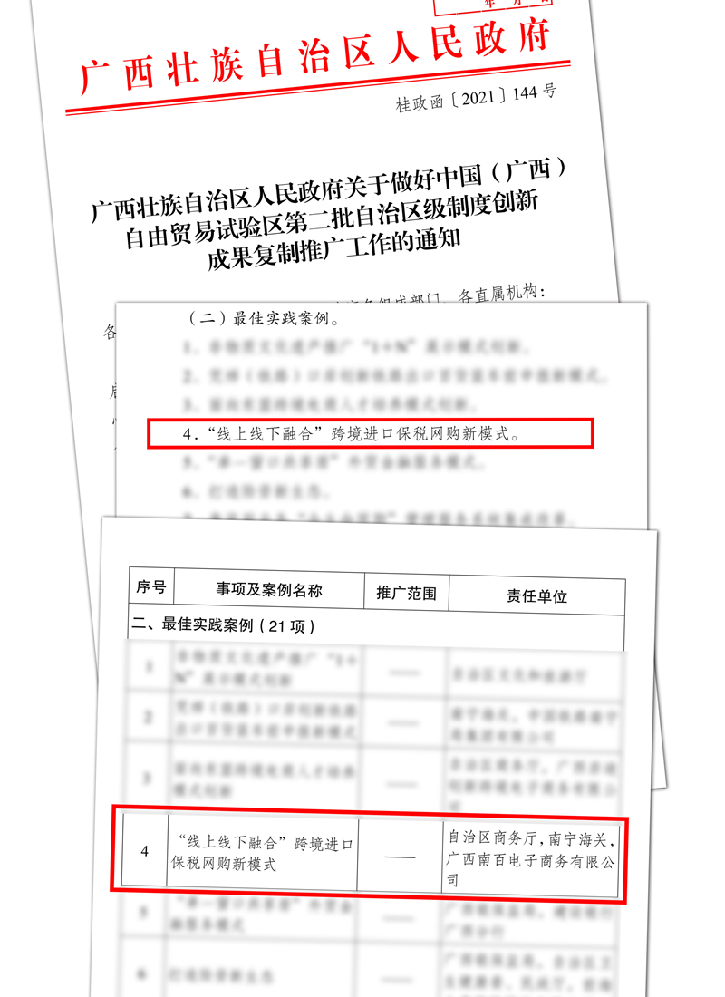 近期,南百保税仓项目在“广西自贸区制度创新成果”中入选最佳案例,并获在全区复制推广。南宁百货紧跟《中国(南宁)跨境电子商务综合试验区发展规划(2021-2025)》要求,持续推动跨境电商线上线下业务发展,通过模式、人才、营销等工作三管齐下,积极主动探索业务新融合新动能,做好南百保税仓运营。
