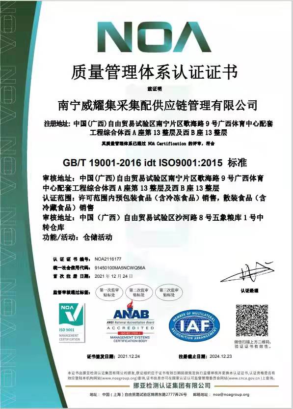 威耀供应链通过ISO三大体系认证提速标准化建设