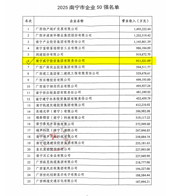 近期,南宁市企业和企业家联合会发布2025年“南宁企业50强”“南宁服务业30强”榜单,南宁威宁集团成功登榜前述榜单,企业综合实力与行业影响力再次得到肯定。近年来,集团锚定高质量发展目标,以深化专业化改革整合、强化创新驱动为战略抓手,着力构建高效协同、布局合理的主导产业体系,企业综合实力不断提升,2025年实现营业总收入约100亿元,同比增长超16%;利税总额5.4亿元,同比增长超15%;完成入统固定资产投资超13亿...